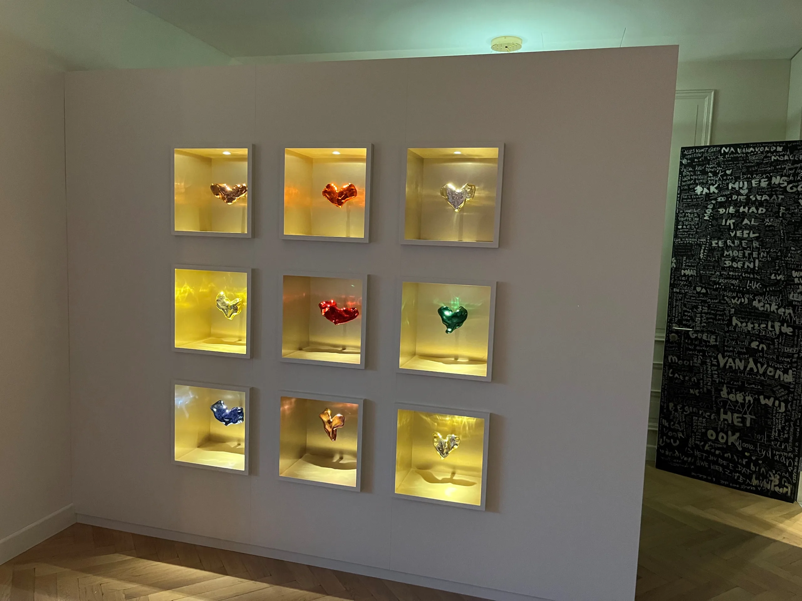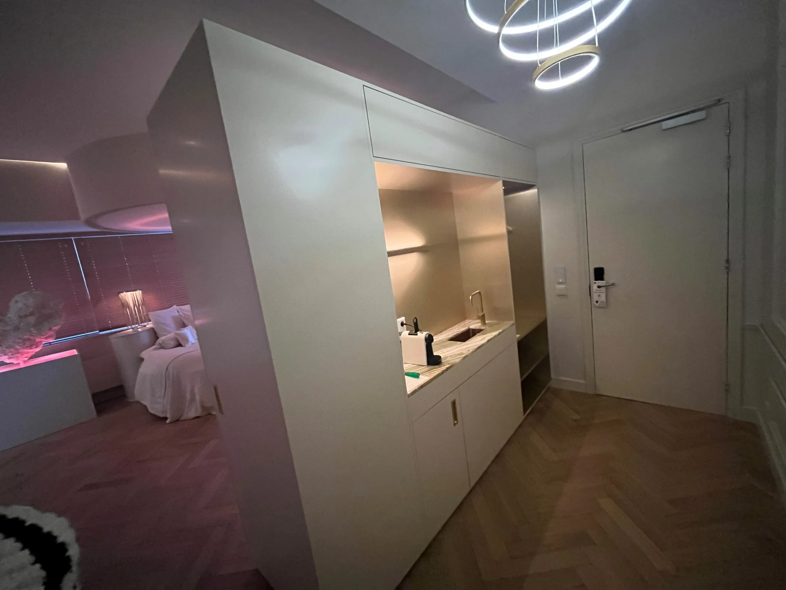 Diverse kamers hebben een thema. Zo mochten wij de “love under construction” suite compleet maken met een prachtige kunstkast, vol van liefde. Aan de andere kant van de kast zit een keukenblokje.